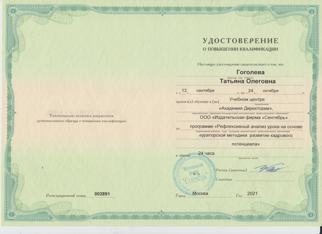 "Рефлексивный анализ урока на основе кураторской методики: развитие кадрового потенциала", 24 часа, 2021 г. |