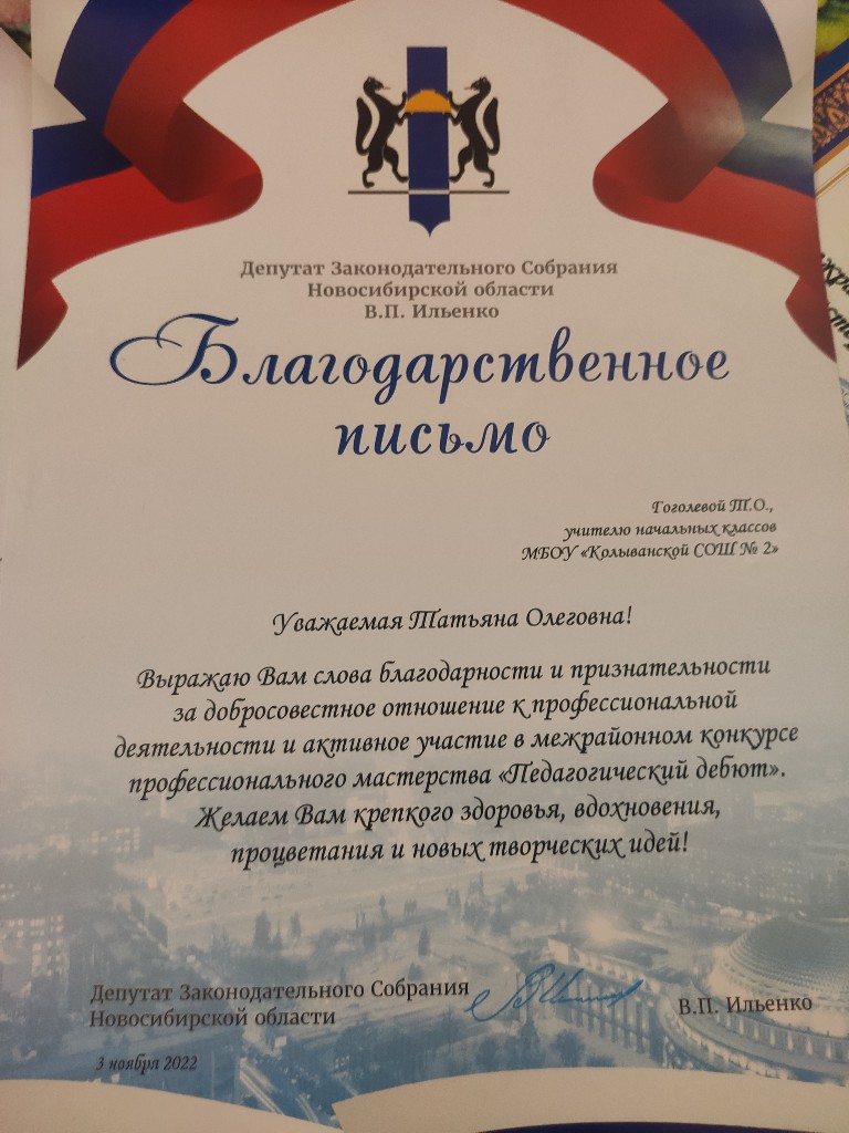 Благодарственное письмо от Депутата Законодательного Собрания Новосибирской области - В.П. Ильенко, 2022 г. |