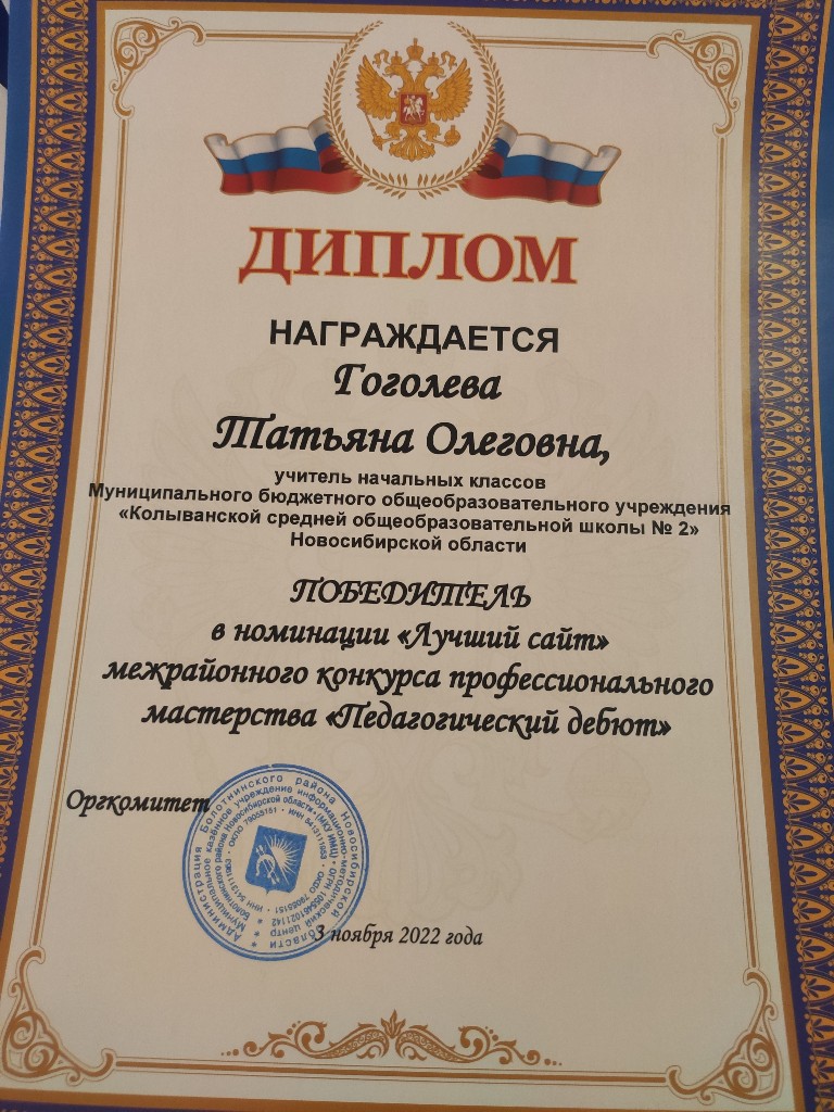 Победа в номинации "Лучший сайт" межрайонного конкурса профессионального мастерства "Педагогический дебют", 2022 г. |