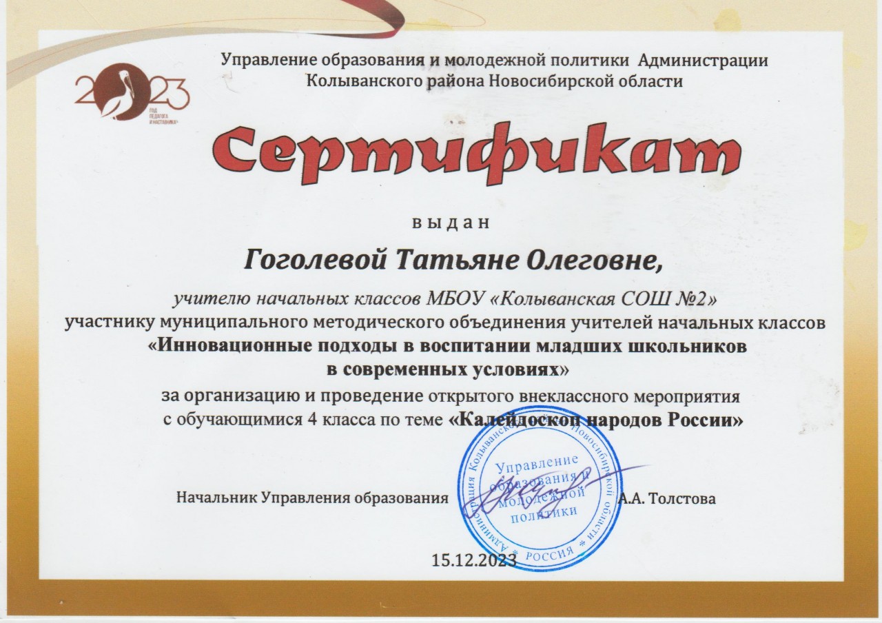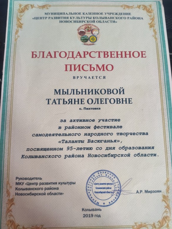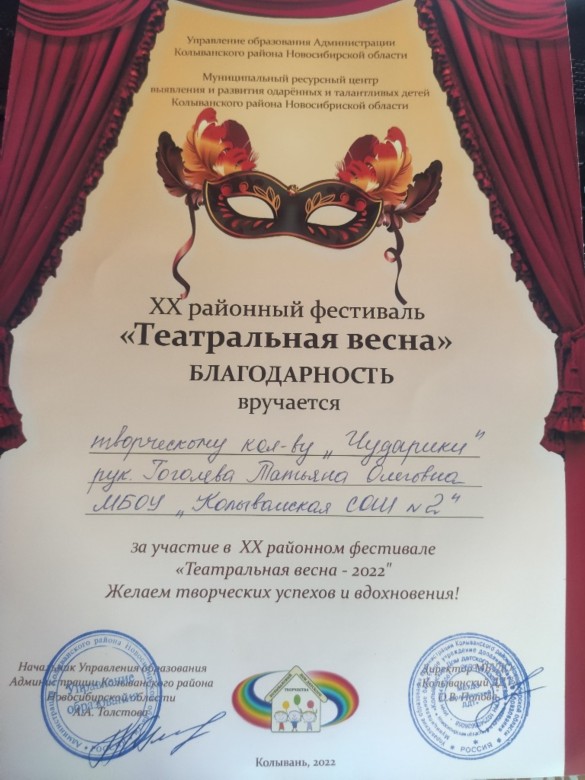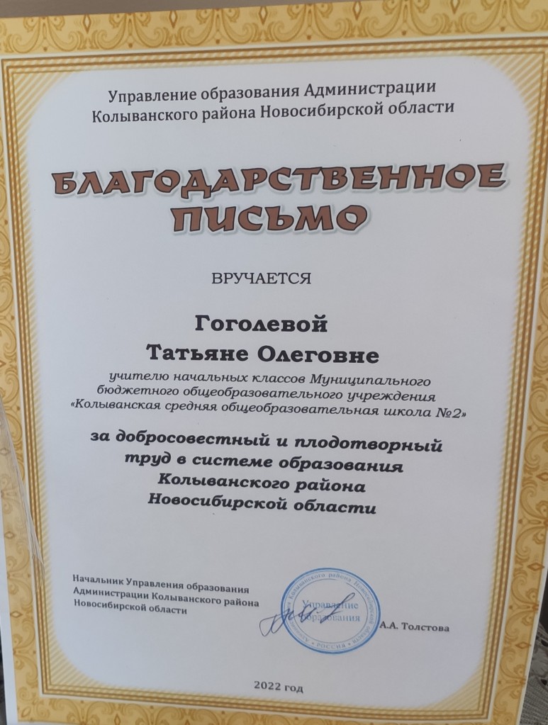 Благодарственное письмо за добросовестный и плодотворный труд в системе образования Колыванского района Новосибирской области, УО Колыванского района Новосибирской области 2022 г. |