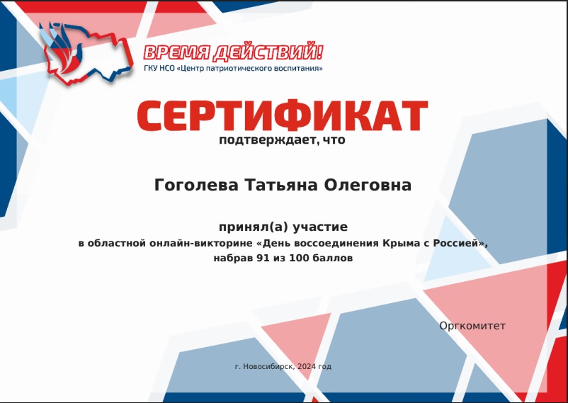 Участие в областной онлайн-викторине "День воссоединения Крыма с Россией", 2024 г. |