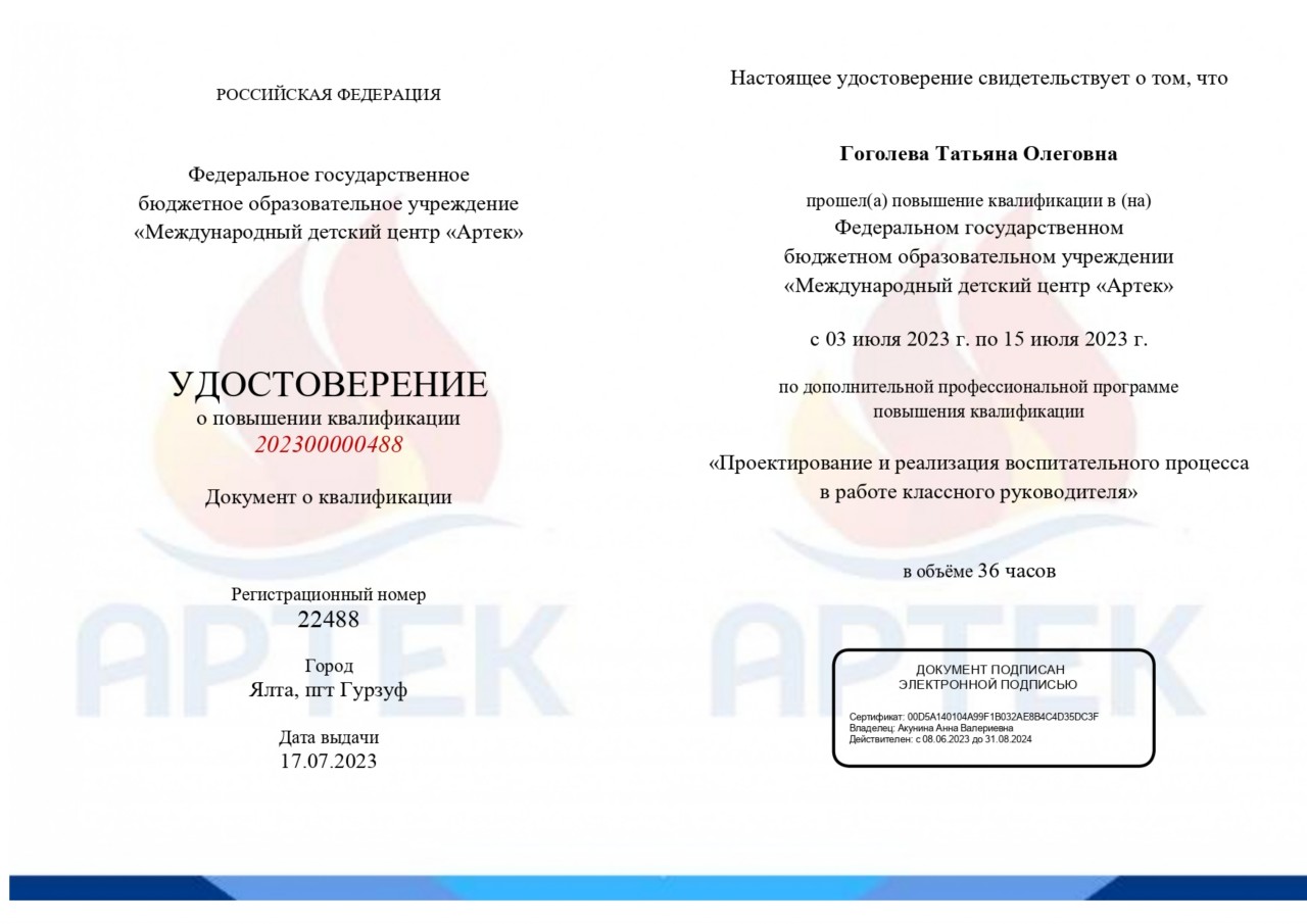 "Проектирование и реализация воспитательного процесса в работе классного руководителя", 36 часов, 2023 г. |
