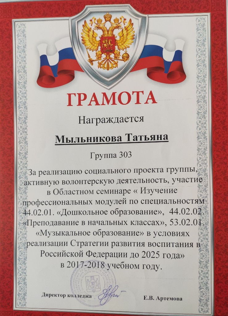 Грамота за реализацию социального проекта группы, активную волонтерскую деятельность, участие в Областном семинаре "Изучение профессиональных модулей...", 2018 г. |