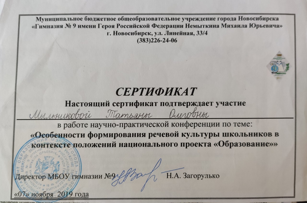 Участие в конференции "Особенности формирования речевой культуры школьников в контексте положений национального проекта "Образование", 2019 г. |