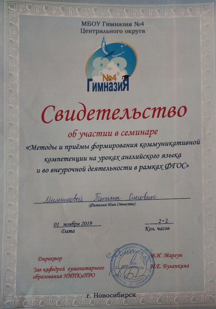Семинар "Методы и приемы формирования коммуникативной компетенции на уроках английского языка и во внеурочной деятельности в рамках ФГОС", 2019 г. |