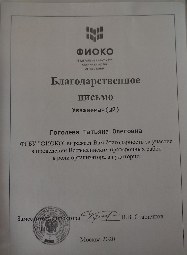 Благодарность за участие в проведении ВПР, 2020 г. |