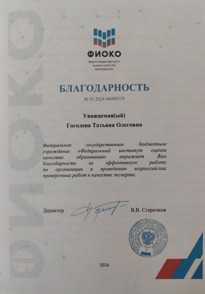 Благодарность за участие в проведении ВПР, 2024 г. |