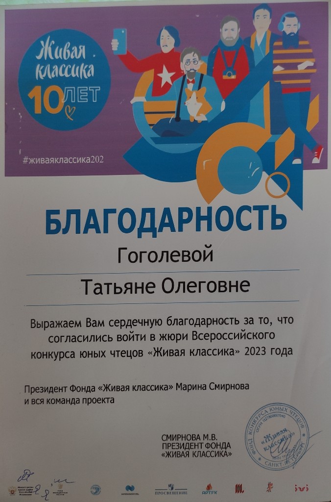Благодарность за выполнение роли жюри на конкурсе "Живая классика", 2023 г. |