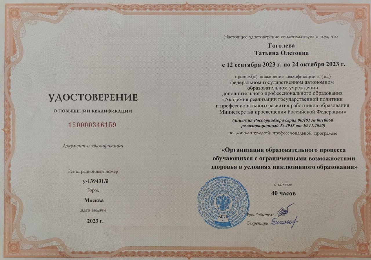 "Организация образовательного процесса обучающихся с ограниченными возможностями здоровья в условиях инклюзивного образования", 40 часов, 2023 г. |