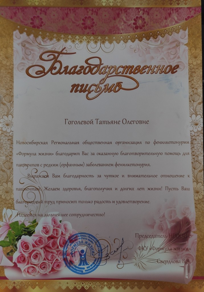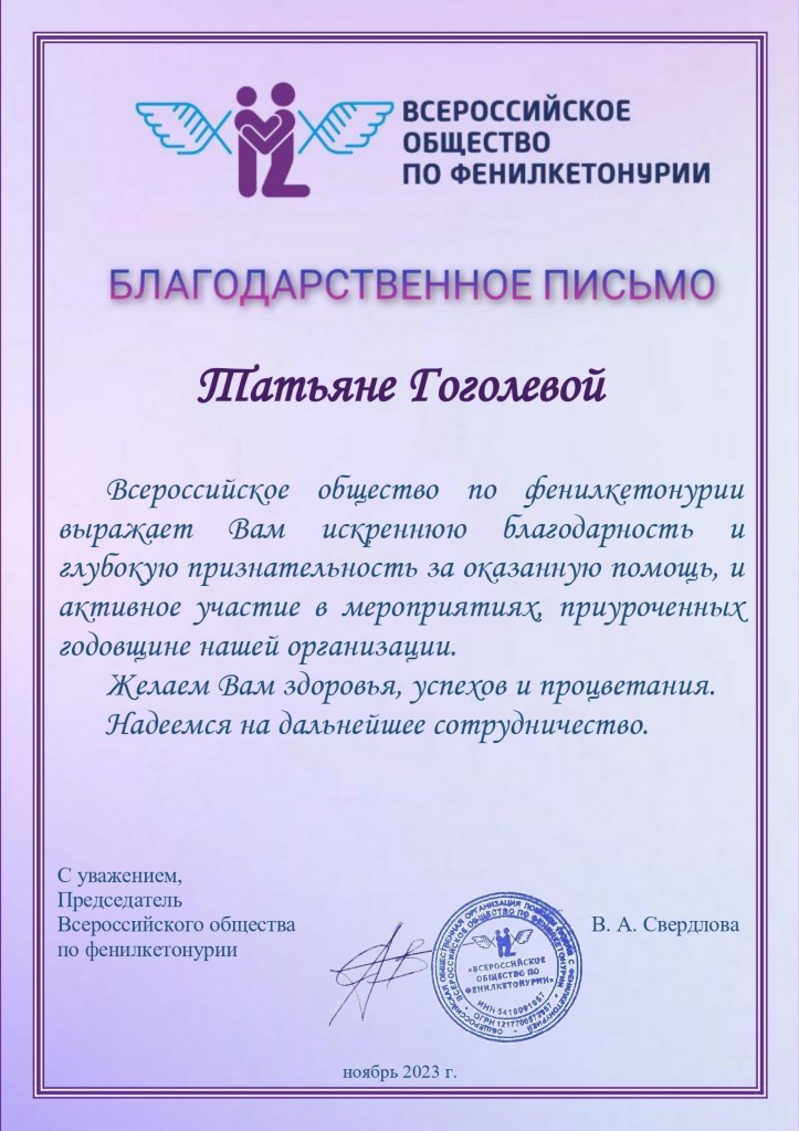 Благодарность за оказание благотворительной помощи для пациентов с редким (орфанным) заболеванием фенилкетонурия, 2023 г. |
