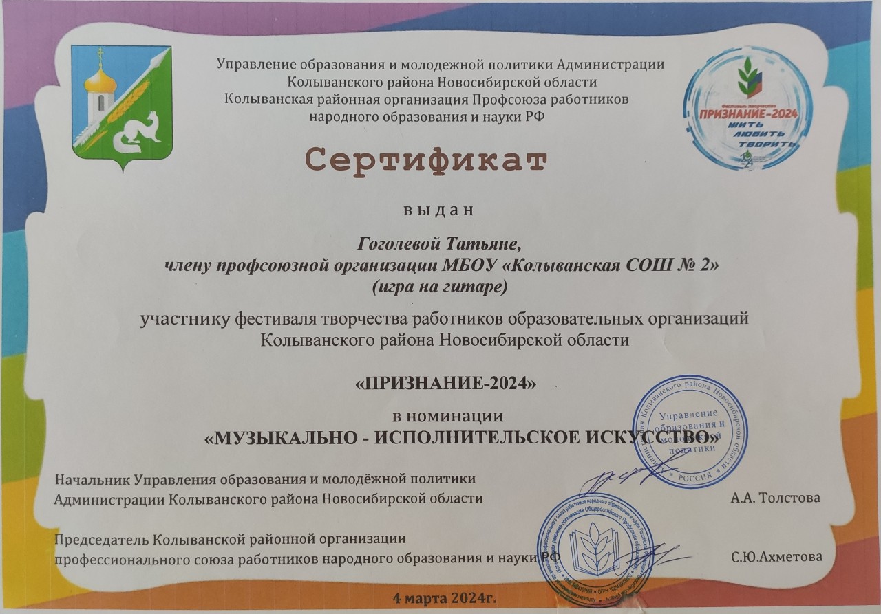 Участие в фестивале творчества работников образовательных организаций Колыванского района Новосибирской области "Признание-2024", 2024 г. |