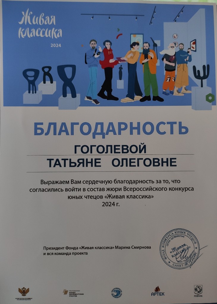 Благодарность за выполнение роли жюри на конкурсе "Живая классика", 2024 г. |