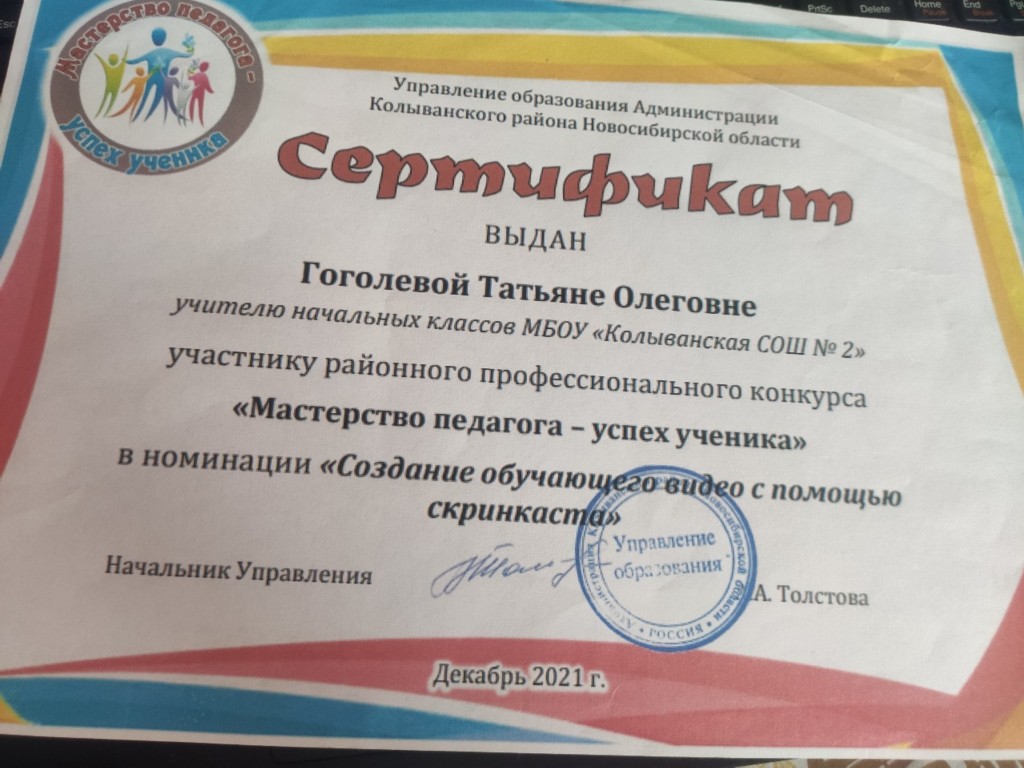 Участие в конкурсе "Мастерство педагога - успех ученика" - номинация "Создание обучащего видео с помощью скринкаста", 2021 г. |