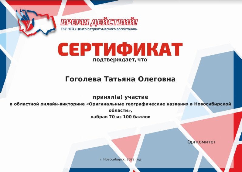 Участие в областной онлайн-викторине "Оригинальные географические названия в Новосибирской области", 2022 г. |
