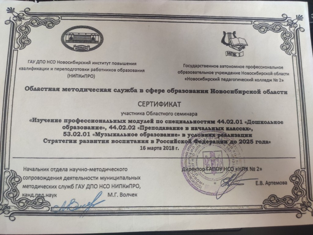Семинар "Изучение профессиональных модулей по специальностям 44.02.01 "Дошкольное образование", 44.02.02 "Преподавание в начальных классах", 53.02.01 "Музыкальное образование" в условиях реализации Стратегии развития воспитания в РФ до 2025 года", 2018 г. |