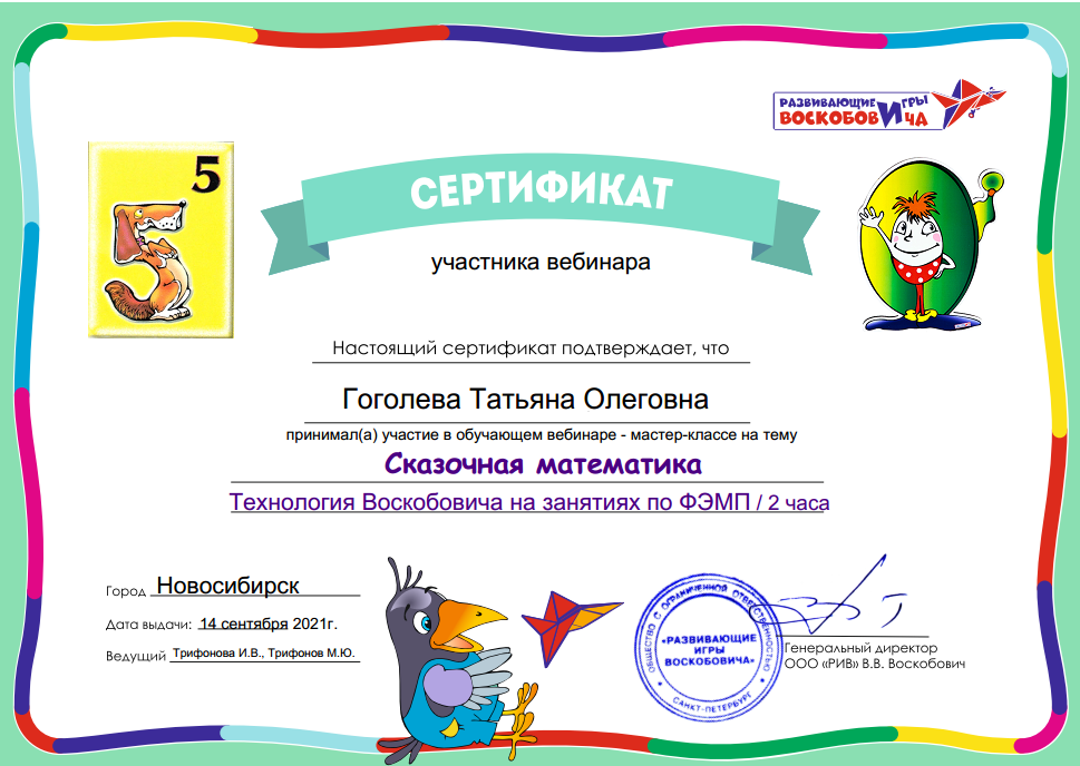 Вебинар "Сказочная математика. Технология Воскобовича на занятиях по ФЭМП", 2021 г. |