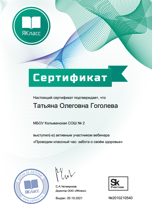 Вебинар "Проводим классный час: забота о своем здоровье", 2021 г. |