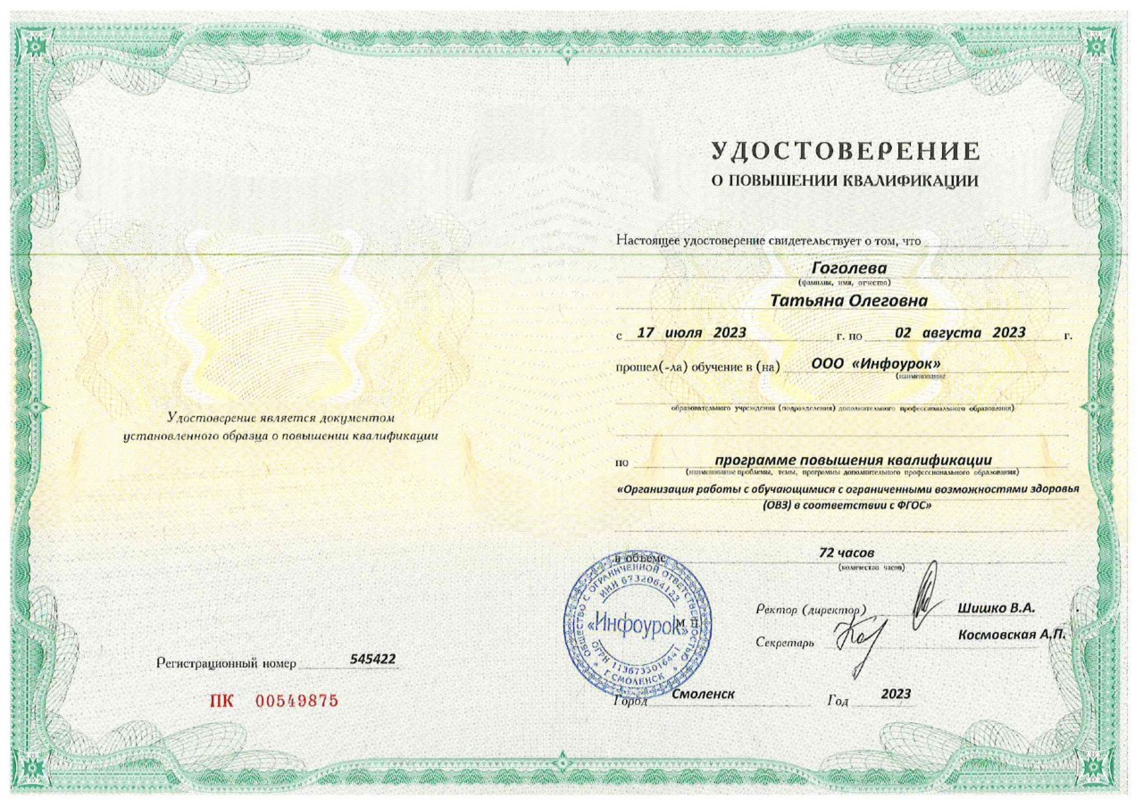 "Организация работы с обучающимися с ограниченными возможностями здоровья (ОВЗ) в соответствии с ФГОС", 72 часа, 2023 г. |