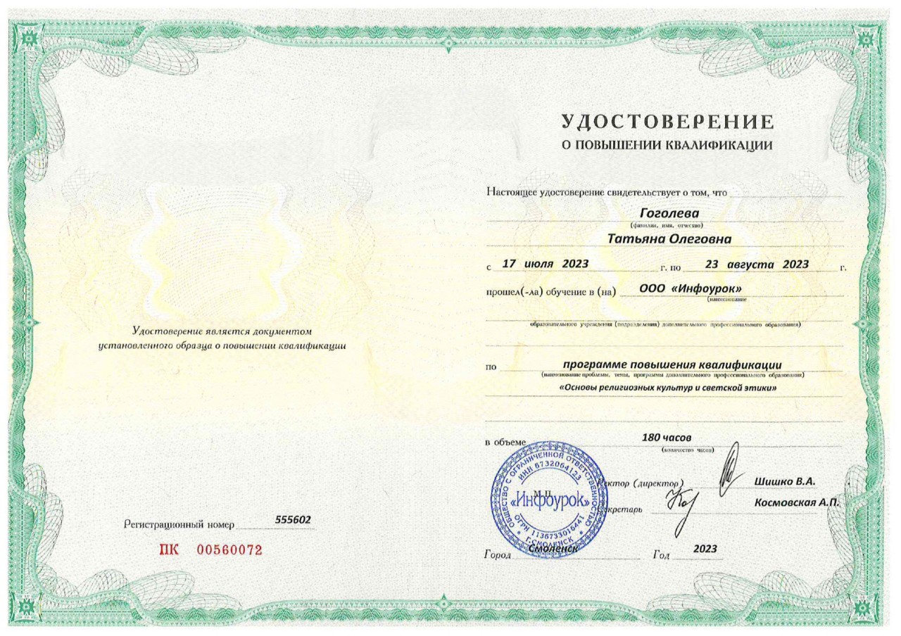 "Основы религиозных культур и светской этики", 180 часов, 2023 г. |