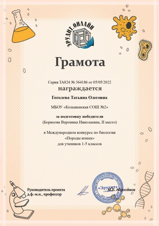 Подготовка учащегося (2 место) к Международному конкурсу по биологии "Породы кошек", 2022 |