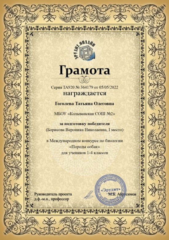Подготовка учащегося (1 место) к Международному конкурсу по биологии "Породы собак", 2022 г. |