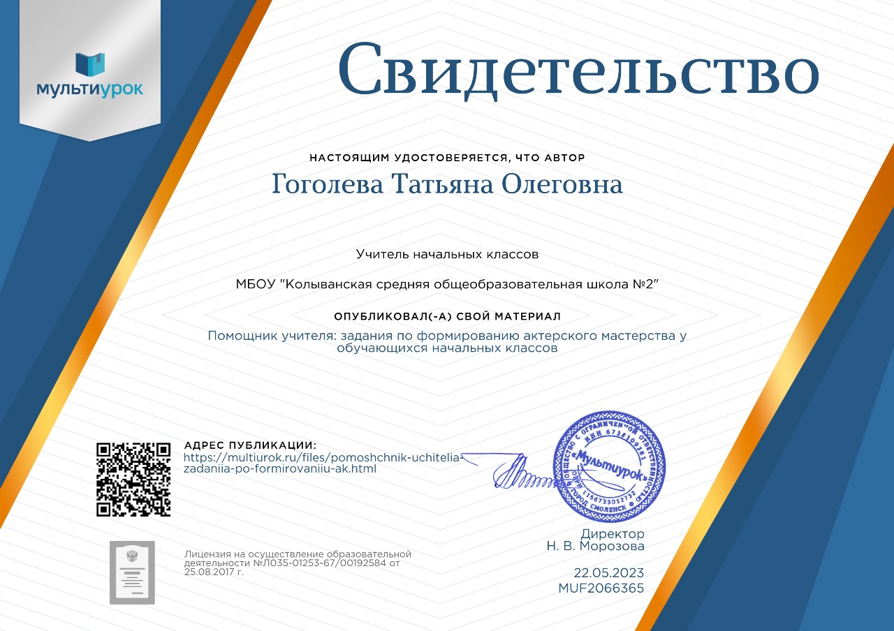 Свидетельство о публикации собственной методической разработки на сайте multiurok.ru, 2023 г. |