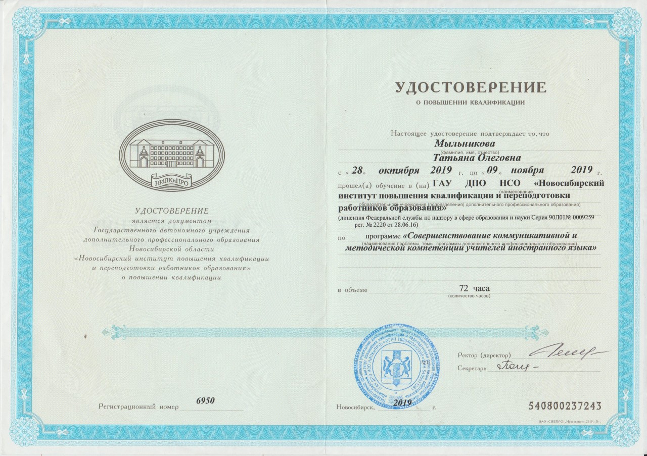 "Совершенствование коммуникативной и методической компетенции учителей иностранного языка", 72 часа, 2019 г. |