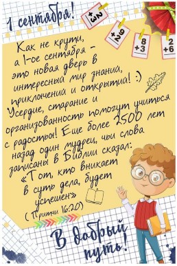 Уважаемые коллеги и родители, дорогие ученики! Поздравляю вас с Днём знаний! Желаю успехов в учёбе/работе, много достижений и новых открытий. Пусть 2024-2025 учебный год пройдет плодотворно, оставив только положительные эмоции и теплые воспоминания!